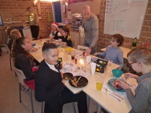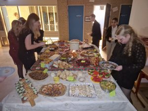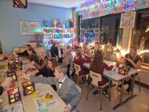 Op woensdag 17 december was iedereen op z’n mooist gekleed voor het kersdiner. Om 16:45 kwamen vaders en moeders met hun kinderen allerlei lekkere hapjes brengen die we met smaak hebben opgegeten. In de tussentijd was er op het plein de mogelijkheid voor ouders/verzorgers om te genieten van warme chocomelk of een glaasje glühwein verzorgd door de OGR. Om 18:15 was het tijd voor de lampionoptocht rond de vijver. Onder leiding van de kerstman was het een waar lichtjesspektakel.